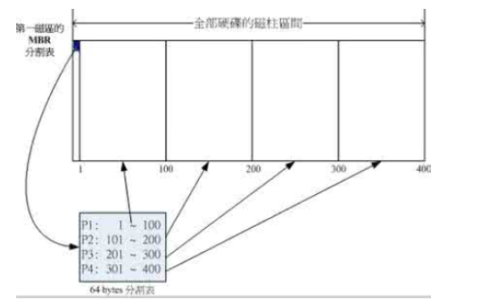 - 硬盘默认的分区表仅能写入四组分区信息。